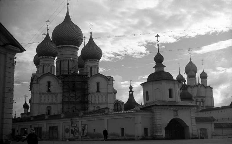 Успенский собор – самый старый из памятников Ростова (16 в.). На юг от него разместился Кремль, из которого видно надвратную церковь Воскресения.