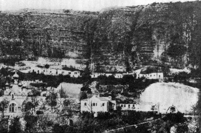 Общий вид средней и верхней террас Успенского монастыря у Бахчисарая. Фото из книги Е. Маркова «Очерки Крыма» [Марков Е. Л. Очерки Крыма. – СПб.: тип. М.О.Вольфа, 1902 г.]. |
