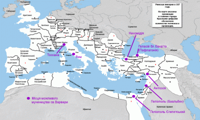 Топографія можливих місць мучеництва св. Варвари на карті Римської імперії (топооснова – з )
