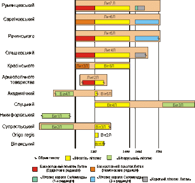 Тому для дослідження ці літописні збірники слід поділити на логічні частини, орієнтуючись на зміст творів. Цим частинам ми надамо формалізовані назви (Біл1Л – Білоруський 1-й літопис, Віт1Л – Вітовтів 1-й літопис, Лит1Л – Литовський 1-й літопис). Головна причина запровадження формалізованих назв полягає у поділі рукописів, а до того ж: