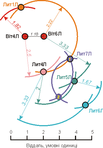 Побудову графа слід починати з пари об’єктів, котрі зв’язані між собою найтісніше, в нашому випадку це пара Віт4Л – Віт6Л. Отже, малюємо два кола (на рисунку – червоні) і розносимо їх на віддаль 1.18. Із точки Віт4Л проводимо дугу радіусом 2.5 (рожеву), а із точки Віт6Л – дугу радіусом 2.22 (жовтогарячу). Їх перетин дає нам точу розташування Лит4Л (рожеве коло). Для визначення позиції Лит5Л ми вибираємо із трьох можливих віддалей дві найменші й проводимо дуги (зелені) радіусом 2 довкола Лит4Л і радіусом 3.33 – від Віт6Л. Їх перетин дає нам позицію Лит5Л.