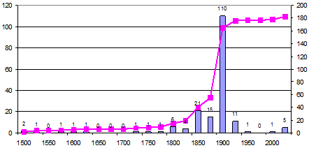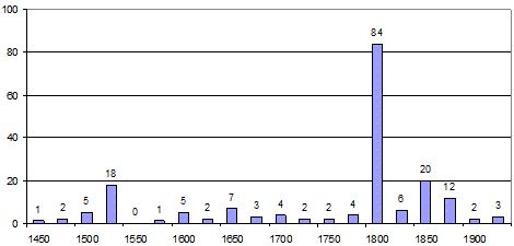 Звістки згруповані по періодах 25 років. Тому проти дати «1800 рік» стоїть число звісток (84) за 1776 – 1800 роки