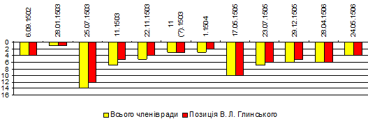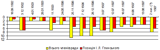 Читати цю і наступні подібні діаграми слід наступним чином: по горизонталі (осі абсцисс, хто пам’ятає середню школу) відкладено дати документів. По вертикалі (осі ординат) відкладено жовті стовпчики – загальне число членів ради, згаданих у документі, червоні стовпчики – позиція цікавої нам особи (І. Л. Глинського) в переліку. В нульовій позиції знаходиться сам правитель, великий князь литовський, тому чим коротшим є червоний стовпчик – тим ближче дана особа до начальства, тим більшу вагу слід припускати. З цією та подібних діаграм видно, що порядок членів ради ВКЛ не був фіксованим, один тільки віленський єпископ Войтех (Альберт) завжди називався першим, якщо він був присутнім.