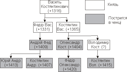 Для середньої (суздальської) гілки роду ми не маємо досить матеріалу, щоб стверджувати якусь закономірність пострижень. Після того як Москва захопила Суздальсько-Нижегородське князівство, ці князі переходять на службу до московських правителів і відповідно до логіки літописців – зникають зі сторінок наших джерел. Літописи не цікавляться служилими князями так само, як вони не цікавляться й іншими слугами – пічниками, собачниками, конюхами…