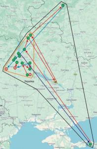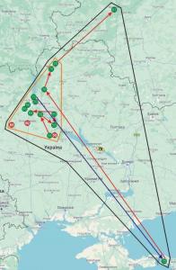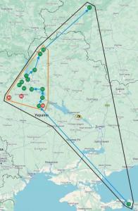 Об’єктів у «Іпатіївській» групі помітно більше, і з ними все виходить непросто. Оптимальний маршрут треба починати з одного із найвіддаленіших об’єктів, щоб не повертатись до нього і зекономити зворотню віддаль. З цих самих міркувань і закінчувати його треба на одному з віддалених об’єктів. Я починаю цей маршрут з Тмуторокані і закінчую Брянськом: 75 → 55 → 58 → 60 → 56 → 64 → 68 → 66 → 70 → 73 → 76 → 78 → 80 → 81 = 1270 км. Він нанесений на наступній схемі блакитними стрілками.