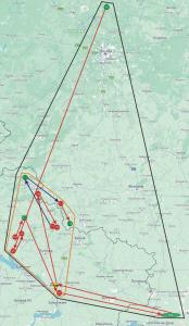 Чорним контуром на картосхемі позначено багатокутник, який охоплює всі об’єкти групи. Діаметр його (95 – 104) дорівнює 1093 км. Зі складу групи хочеться вилучити два сторонніх об’єкти: Скнятин (95) та Сал (104). Думаю, про їх розташування писар СРГ не мав ніякого поняття. З їх вилученням контур групи (жовто-гарячого кольору) набуває діаметр 445 км (103 – 111), або 40 % від повного діаметру.