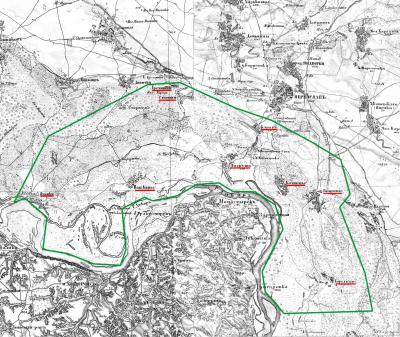 Червоним кольором підкреслено назви сіл сотні, зеленим контуром обведено імовірні межі сотні.