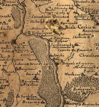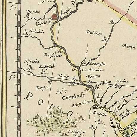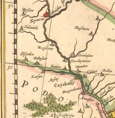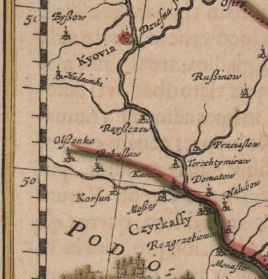 На карті надписано Терехтемирів (Trethymirow) та монастир (Munster). За контуром Дніпра карта належить до третьої традиції, як і належить послідовникам Боплана.