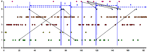 На горизонтальній осі – номер запису в ПКК; на вертикальній осі: 1 – достовірні записі; 2 – допустимі; 3 – невідомі / вигадані; 4 – наявні тільки в ПКК; 5 – дублікати; 6 – літературні. Похилі стрілки з’єднують дублікат з прототипом; вертикальні сині лінії – границі частин.