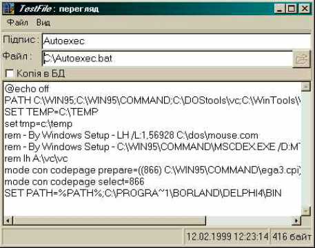 Файл. Тип призначено для зберігання довільної послідовності байтів. Редагування атрибуту здійснюється в спеціальному вікні, за допомогою якого задається підпис файлу, вказується файл-джерело даних, визначається, чи буде зберігатись копія файлу в БД. Це вікно ієрархічно підпорядковане вікну, в якому знаходиться атрибут. Додаткова зручність полягає у можливості переглядати (але не редагувати) початок файлу у вигляді тексту чи шістнадцяткового коду (меню “Вид”). В рядку стану редактор показує дату та розмір файлу. Якщо користувач заміняє джерело даних, програма вимагатиме підтвердження такої заміни.