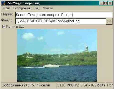 OLE об’єкт. Тип призначено для зберігання OLE об’єктів. Редагування атрибуту здійснюється в спеціальному вікні. За допомогою меню “Файл” здійснюється створення нових OLE об’єктів та створення об’єктів з файлів; меню “Редагування”, зокрема, дає змогу вживати операцію спеціальної вставки; меню “Вид” дає змогу підібрати найкращий вигляд об’єкту (на прикладі застосовано режим вписування об’єкта у вікно).