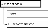Установа – клас, який призначено для збереження інформації про установи. Атрибут Тип (тип даних – ієрархічний перелік) дає формалізовану класифікацію установи. Атрибут Є частиною (тип даних – вказівник на екземпляр класу Установа) дає можливість зв’язувати установи в ієрархічні дерева (наприклад, дивізія є частиною корпусу, корпус – частиною армії, і т.д.).