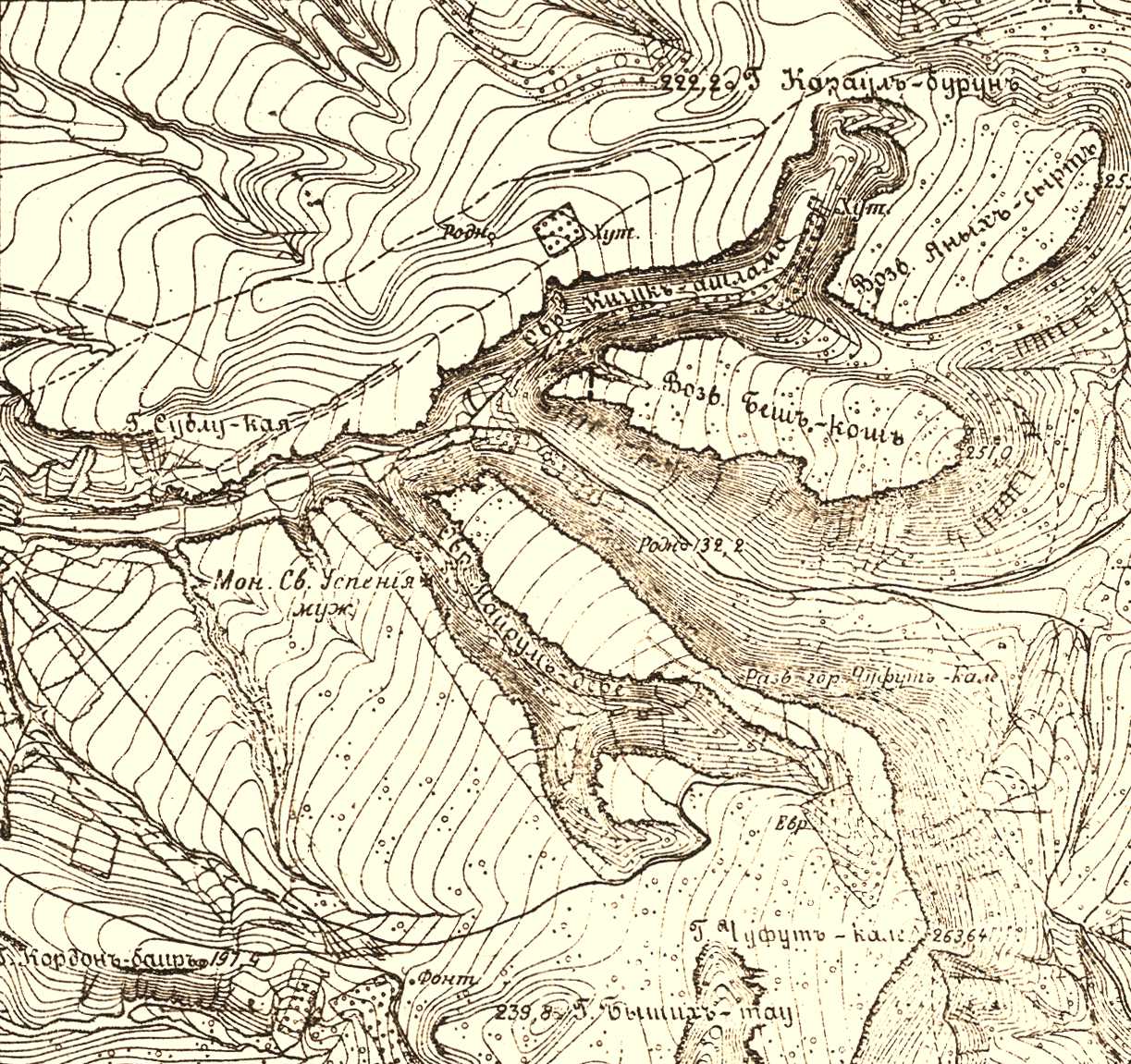 Detail of "The map of the Crimea land". – S.-Pb.: Military Topographic Depot, 1890. Shooting of captain Pavlov and lieutenant Ignatov, May 1 – November 1, 1890. Scale – 1 versta in inch (1: 42000). On it, as we have seen, we marked the Assumption Monastery, Chufut-Kale and mass microtoponyms.