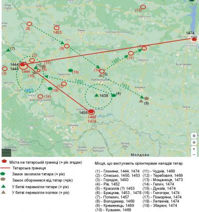 | August 1474 | 7 thousand Crimean Tatars of Prince Ayder | Kamianets-Podilskyi, Halych, eastern outskirts of Lviv land, Zbarazh | 200 | 100 | 9500 | 18,000 to 20,000 prisoners | The castles of Lytvyniv, Zbarazh were captured; defended the castles of Dunajiv, Pomorjany; the Polish pursuit did not catch up with the Tatars |