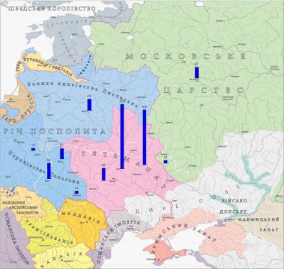 [The basis of the map with political boundaries as of 1657 was provided to me by Dmitry Vortman, for which I express my sincere gratitude.]