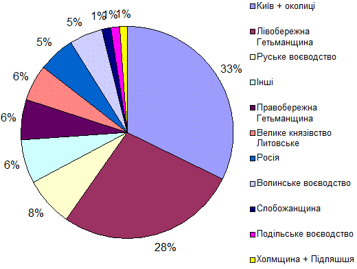 The main surprise of the distribution of names in the current part of VS is its unionist nature: 919 out of 1115 mentions refer to the territory of modern Ukraine, or 82%! The territories that in the previous periods traditionally gave a high contribution – Russia, modern Belarus and Lithuania – at that time show much less interest in Kiev, at the same time we observe a strong growth of mentions from the left-bank Hetmanate and Rus voivodeship. Smaller, but also quite clear impact gave Slobozhanshchina, which during this period has just begun to be populated, Kholmschina with Podlyashia, as well as the Podolsky voivodeship (the last is practically not represented in previous periods).