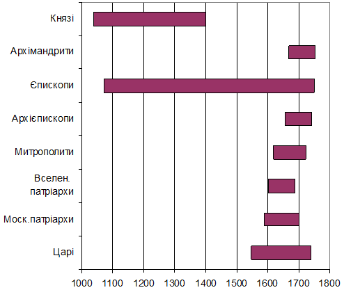 6. Глубина исторической памяти в разных списках неодинакова. Общеимперский список начинается с 1547 г. (царский титул Ивана Грозного). Список киевских митрополитов начинается с 1620 г., черниговских архиепископов – с 1657 г. Наибольшую глубину показывают списки черниговских епископов (от 11 в.) И князей (также от 11 в.), как видно из следующей диаграммы.