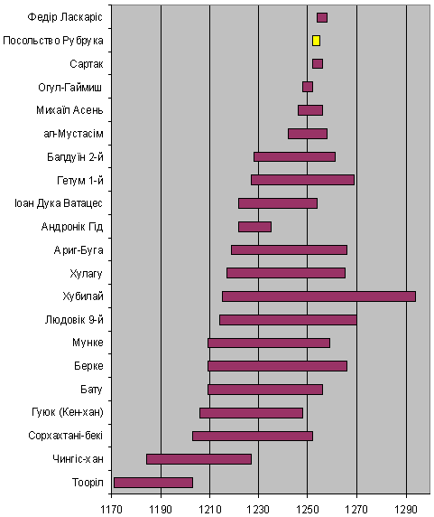 Из диаграммы сосуществования исторических деятелей видно, что новейшая история началась для Рубрука около 1170 г., когда на историческую арену выступили Тоорил (Ван-хан кераитский) и его союзник и противник Темучжин (Чингис-хан монгольский). Глубина сведений из новейшей истории составляет примерно 80 – 85 лет, то есть три поколения. Это, пожалуй, максимально возможная глубина устной исторической памяти (все более давние события сливаются в фольклорные «незапамятные времена»).