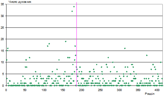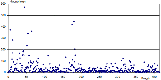 Вертикальная фиолетовая линия – медиана распределения: 50% имен записано в разделах 1 – 135 (слева), а 50% – в разделах 136 – 415 (справа)