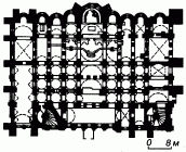 Архітектура. Ядро собору складається з п’яти нав, що закінчуються на сході півциркульними апсидами. З півночі, заходу та півдня собор оточено двома галереями: внутрішньою двоповерховою та зовнішньою (первісно одноповерховою). У західну зовнішню галерею вписано дві квадратні у плані сходові башти з гвинтовими сходами, якими піднімались на другий поверх (хори) собору. Ззовні собор мав пірамідальну композицію: від низьких зовнішніх галерей до найвищої точки – центрального верху. Унікальною особливістю конструктивної системи собору були аркові контрфорси (аркбутани), котрі гасили бічний розпір склепінь (один аркбутан зберігся у західній галереї). Первісний дах був із свинцевих листів, укладених прямо на склепіння.