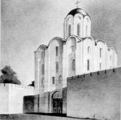 Графічна реконструкція первісного вигляду Троїцької церкви, виконана Ю. С. Асеєвим, багато разів публікувалася і добре відома. На ній церква показана з південного заходу, в комплексі з оборонними мурами кінця 12 ст.