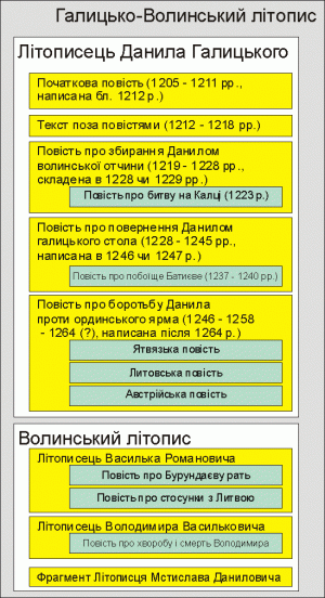 Волинський літопис, насамперед у першій і більшій його частині, є поєднанням окремих повістей, більше чи менше оброблених пізнішими складачами і редакторами [ГВЛ-К, с. 52].