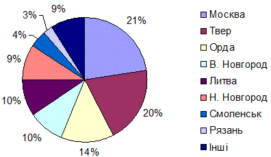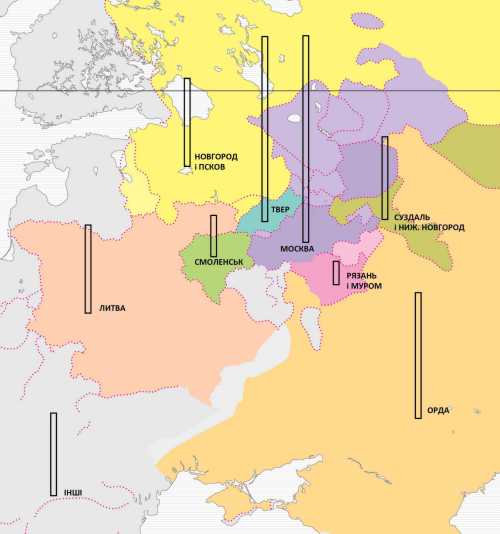 Із цих зовнішніх назв дві стосуються сусідів Великорусії – це Литва та Орда (разом 105 згадок, 18 %), причому назва «Орда» має не так географічне, як політичне значення. Коли літописець писав «князь поїхав до Орди», він мав на увазі не прогулянку степами, а зустріч з царем; тобто Орда – це царська ставка, центр політичної влади. В Орді РогЛ знає тільки 4 міста (Сарай – Бездеж – Болгар – Жукотин). Чи назва Орнач стосується міста, чи області – не ясно.