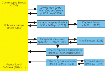 Далі треба було використати ще ярлики кримських ханів, бо в них теж було трохи про Побожжя. Так відділилась робота «Географія кримських ярликів 15 – 16 ст.», а для того, щоби пояснити деякі моменти у географії ярликів, довелось написати окрему роботу «Князі Глинські».