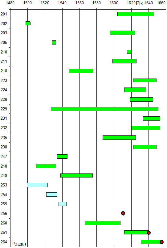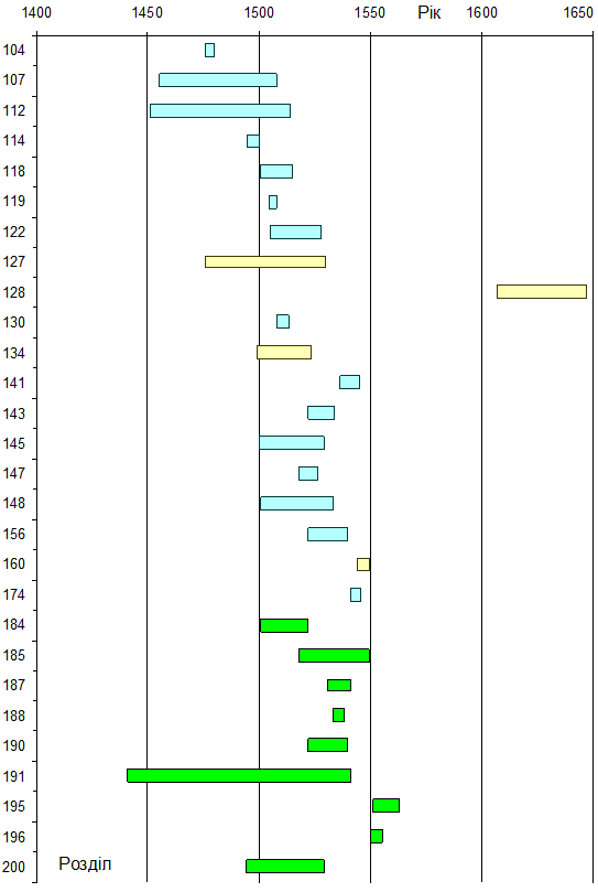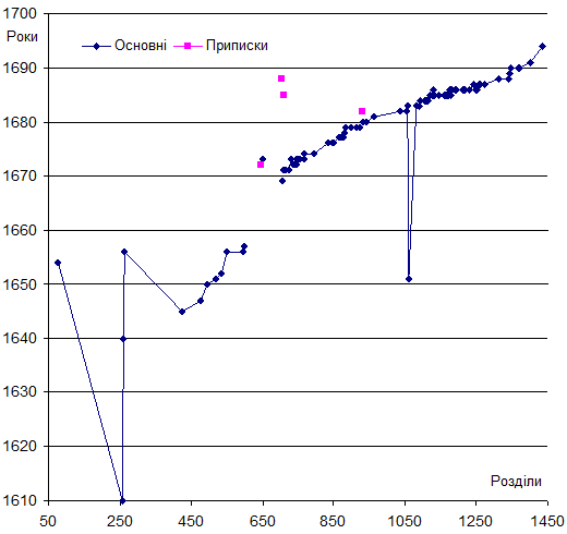 Подивимось тепер, наскільки рівномірно вносились записи в основній частині ВС (розділи 256 – 1401). На підставі твердих дат можна поділити розділи наступним чином: