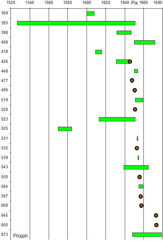 13. Складніше зрозуміти тверду дату 1673 р. в розділі 650, котрий, за запропонованою інтерполяцією, мав би належати до 1669 року.