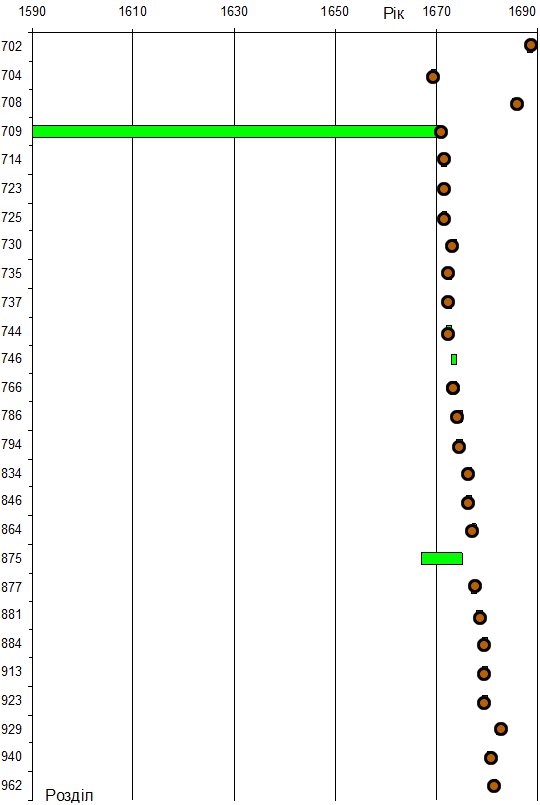 14. Розділ 704 з твердою датою 1669 р. трохи «відстає» від інтерполяційної дати 1670 р. Так само, як і вище, можна припустити внесення запису з окремого аркуша дещо пізніше.