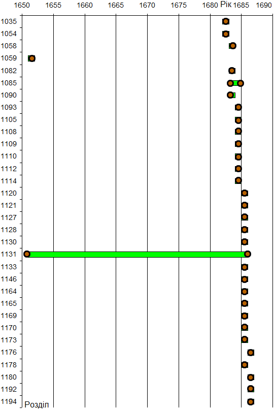 17. Так само «забігають наперед» розділи 1176 з твердою датою 20 лютого 1686 р. (вписаний між розділами з датами 23 вересня та 20 грудня 1685 р.) і 1243 з твердою датою 11 липня 1687 р. (вписаний між розділами з датами 2 серпня та 22 листопада 1686 р.).