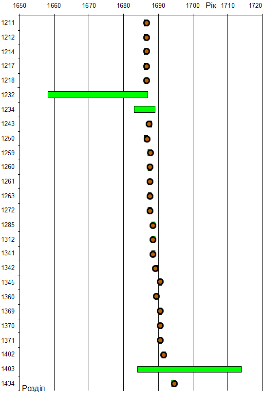 Перша тверда дата – 1 березня 1654 р. – міститься в розділі 78 (князі Волконські), остання – 5 травня 1694 р. – у розділі 1434.