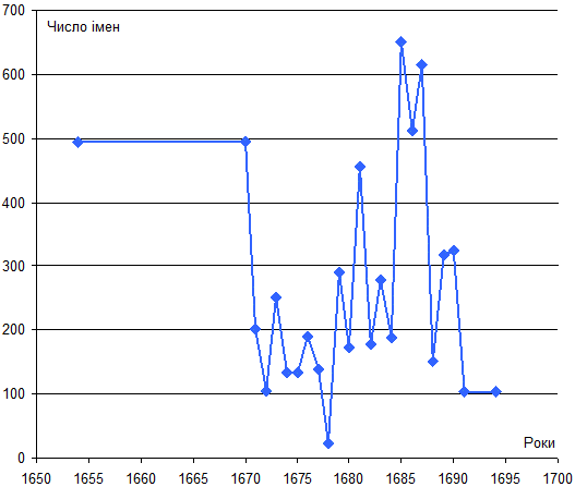 Отже, в поточній частині ВС міститься 1180 розділів і 14142 імені, що дає в середньому на 40 років (1654 – 1694) по 354 імені на рік. Якщо ми припустимо, що розділ 1402 з датою 1691 р. записано на самому початку року, то для періоду 1654 – 1690 рр. маємо 13726 імен (в середньому 381 ім’я на рік), а для епілогу (розділи 1402 – 1435, 1691 – 1694 рр.) – 416 імен, в середньому 104 імені на рік.