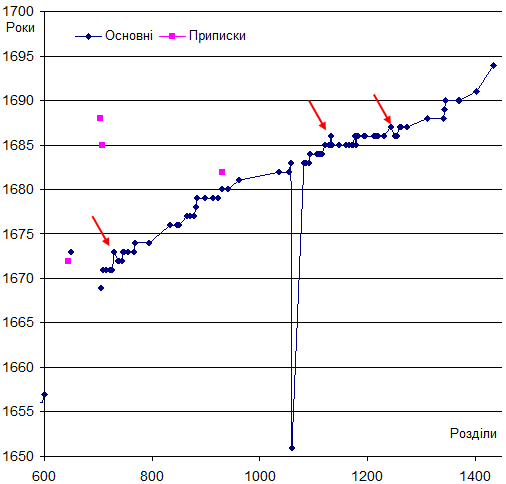 Дати, котрі явно належать до приписок, виразно лежать вище основної лінії дат на діаграмі, тобто можна не мати сумніву, що вони вписані пізніше, і власне є датами зроблених приписок. Червоними стрілками на останній діаграмі (і жовтим тлом у таблиці) позначено перебивки у послідовності дат, коли після більш пізньої дати знову йдуть дати раніші.