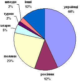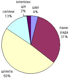 Звернімося тепер до вивчення розподілу персонажів за соціальним станом і національністю. Серед національностей виділимо п’ять основних: українців, росіян, поляків, татар, турків – “и разных прочих шведов” (оскільки в категорії “разных прочих” шведи становлять найчисленніший прошарок – 16 відсотків). У соціальному відношенні розділимо персонажів на чотири основних і одну додаткову групи крові: блакитну (царі), зелену (пани-рада), жовту (шляхта), червону (селяне) – це основні групи; додаткова група – чорно-лілово-фіолетова – належить гнилій інтелігенції, яка не може становити основної групи крові, оскільки вона не шар, а тільки прошарок.